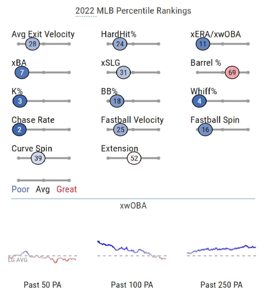 To compound these concerns even further, Hudson ranks below league average in what kind of contact he generates: average exit velocity (28th percentile), expected batting average (7th percentile), expected slugging (31st percentile), HardHit% (24th percentile). His pitches also rank worse than league average on spin rates, an important facet of generating movement and swings and misses.