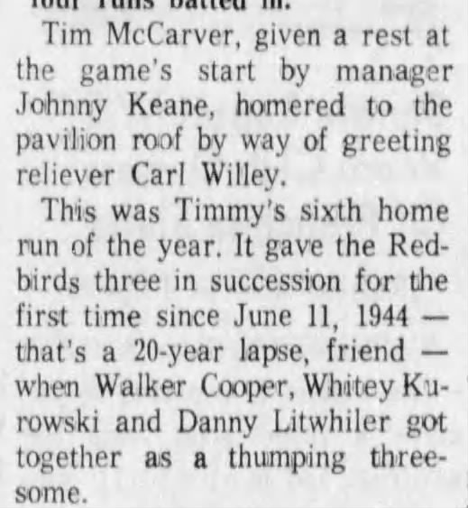 Only 2 of those 10 runs surrendered by Bill were counted as earned. To add insult to injury, the next batter to greet new reliever Carl Willey hit a home run as well. So to cap off an 11 run outburst, the Cardinals went back-to-back-to-back, the first time they did so in 20 years at the time.