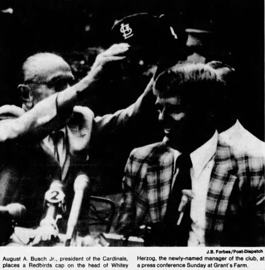 Cards GM John Claiborne, sensing the shifting tides, worked with Whitey under Bing Devine during their tenure with the Mets. Claiborne told Herzog that if he ever became a GM he’d want Whitey as his manager. When Kauffman canned Herzog in 1979 Claiborne immediately called Whitey and asked him if he wanted a job. Whitey said manager. After a 6-20 stretch, Claiborne called Whitey to come out to Grant’s Farm and meet Gussie.