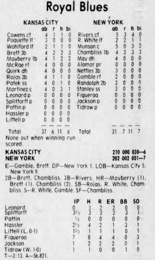 The Royals had no MVPs or Cy Young winners, they could steal but had to manufacture runs. They led the AL with 71 sac flies, their first baseman John Mayberry leading the league with 12. Last year Mayberry posted a 168 OPS+, the best in all of baseball, this season his OPS dropped 300 points to .663. Didn’t matter, he drove in 95 runs. The Royals held a 12 game divisional lead in August but nearly squandered it when they dropped 9 of their last 11 for the season to finish 2.5 games ahead of Oakland.