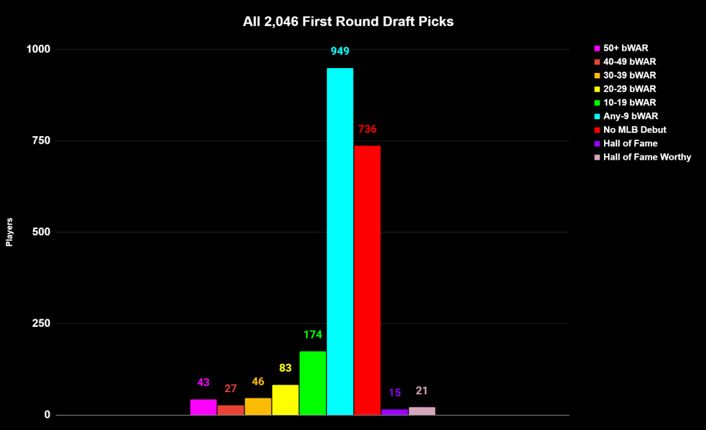 Most of those names aren’t or won’t be in the hall of fame. In fact the numbers show that the plurality of first rounders become replacement level/serviceable big leaguers (946, 46.3%), or they wash out entirely (736, 35.9%). Only 18.2% of 1st round picks go on to have 10+ bWAR careers, or to put it another way they’re more likely to turn out like a Gordon Beckham or Brien Taylor, than a Luis Alicea.