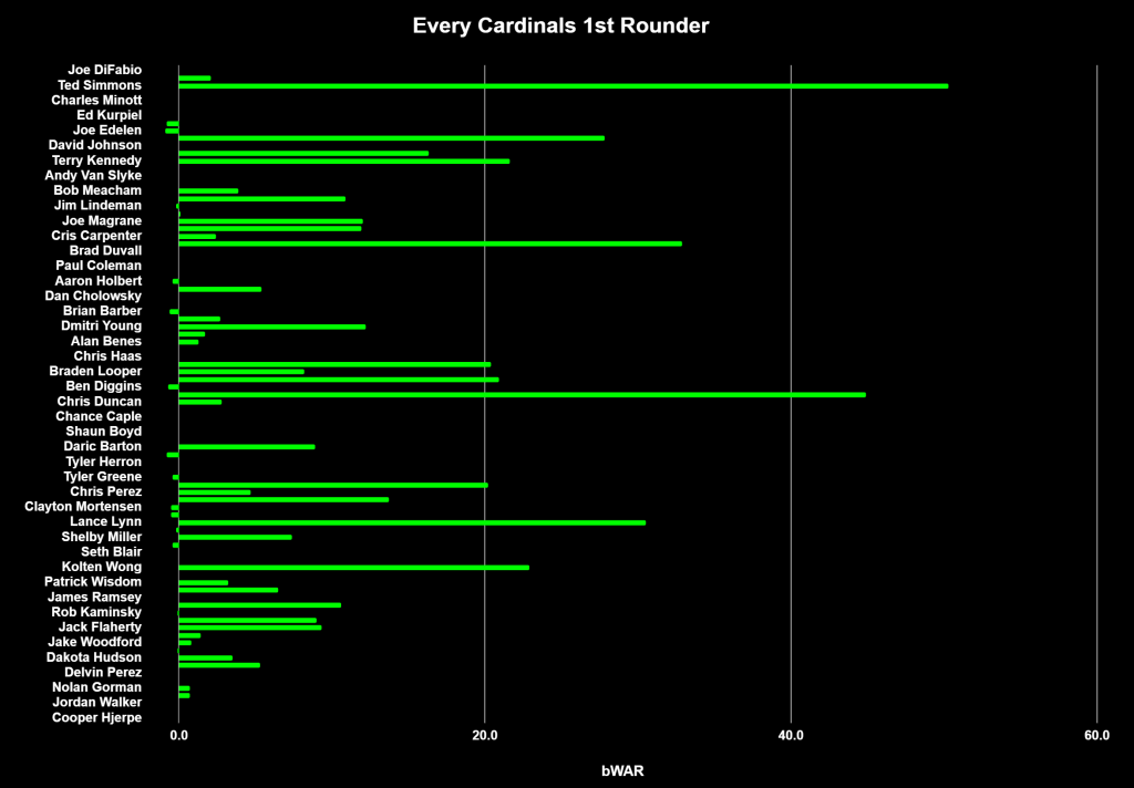 It’s not often the Cardinals lose their ass on a 1st rounder. Delvin Perez got over $2 million only to face PED allegations and hit like someone who wishes they were taking them (he elected free agency after this past season). Prior to Delvin the Cards lost out on…who? Rob Kaminsky? Nick Plummer? From ‘99 to 2001 they drafted 5 players and paid $6,635,000 in bonuses to players who never cracked a big league roster. On the flip side they’ve had consistent runs of “success” like ‘05 to ‘10, or ‘12 to ‘16. They’ve had 31 guys not make a big league roster–so far, this is counting guys like Walker, Michael McGreevy, and Hjerpe–a rate better than league average. 38 of these first rounders went on to crack a MLB roster and produce up to 9.9 bWAR, and a very small amount, 18 guys (or roughly 21%) became Luis Alicea or JD Drew.