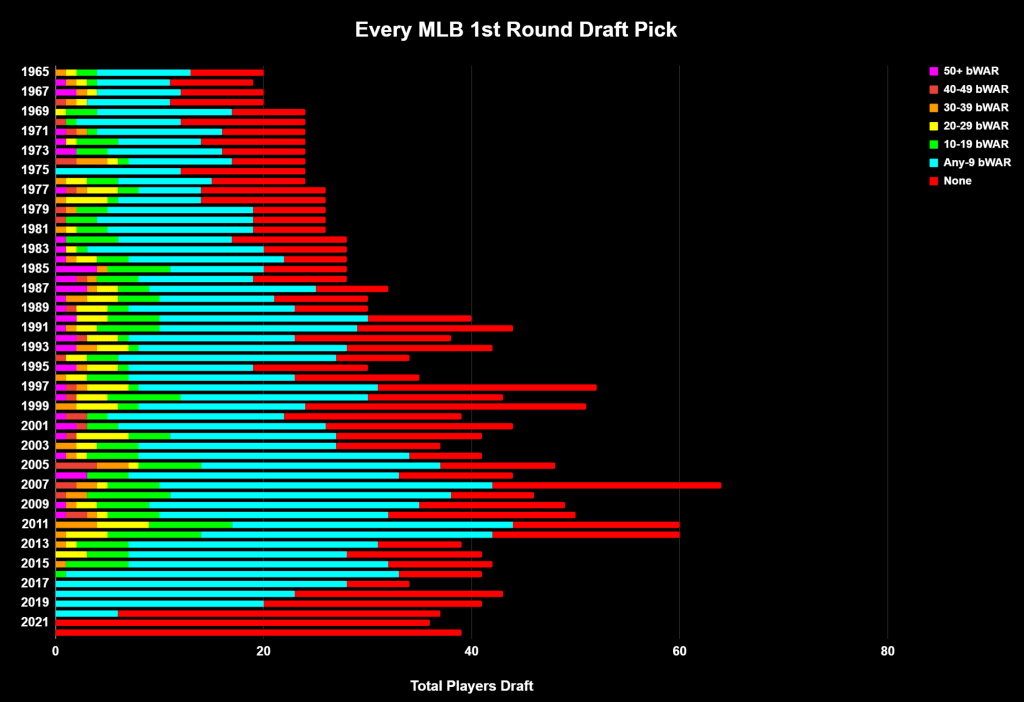 1 We’re going to use baseball-reference WAR formula here, as I used their draft portal to pull every first rounder and felt it would be incredibly tedious to find every player’s fWAR.