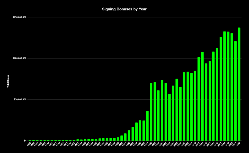Draft signing bonuses have obviously changed historically. First round signing bonuses didn’t crack a million dollars cumulatively until 1972 when Chet Lemon got the fattest check at $78,000. This most recent draft saw over $137 million dollars go to signing bonuses with Jackson Holliday and Druw Jones each receiving sign-ons for over $8 million, however it has not yet eclipsed Spencer Torkelson’s 2020 record mark of $8,416,300.