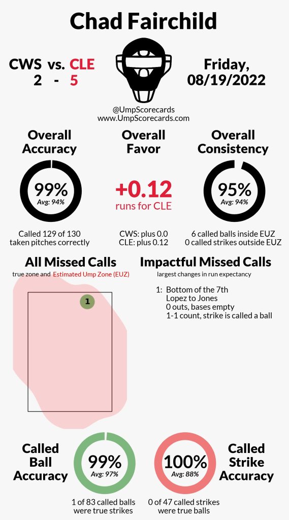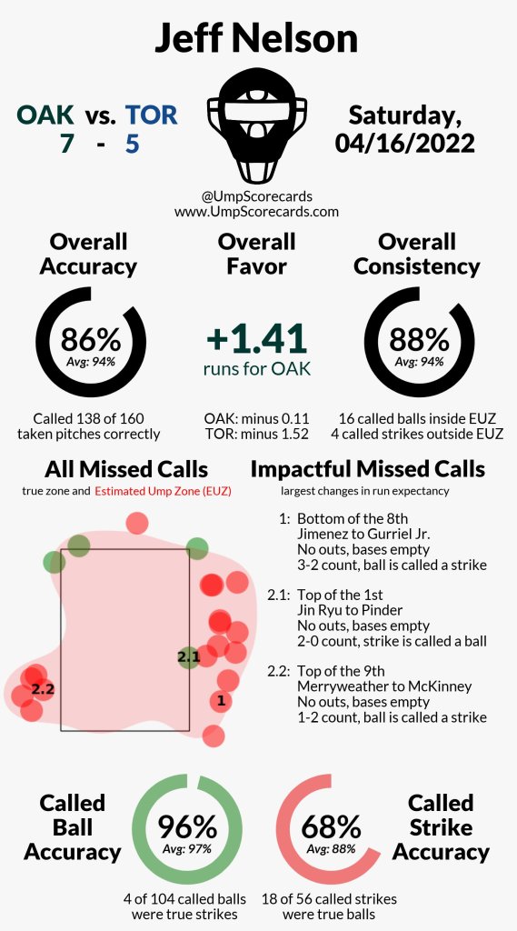 Newcomer Alex Tosi is a good cop though. Give him a gold star, promote this man to homicide. No more call-ups, he’s in the Show for good and there’s reason to be excited when he posts a 94.7% ACC and wins 64% of his challenges. Also helps that his one ejection was also correct and it came at Rocco Baldelli’s expense.