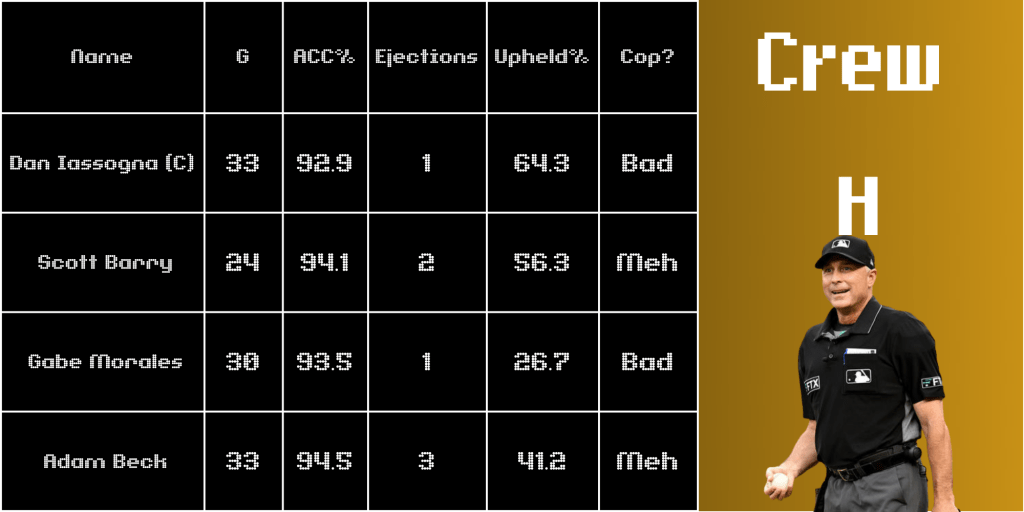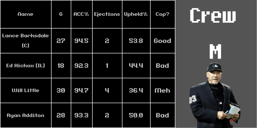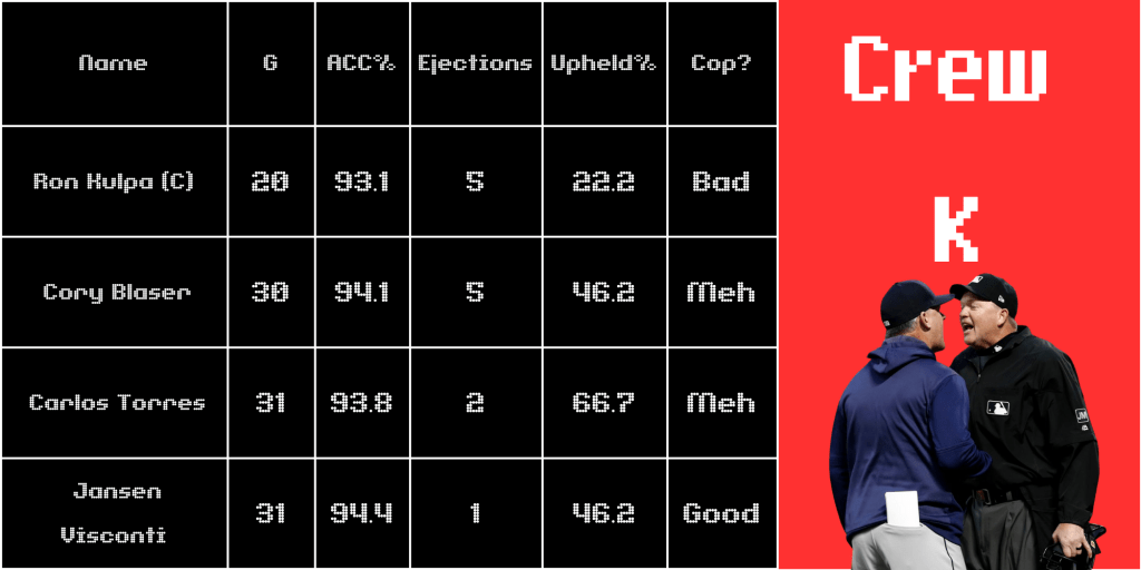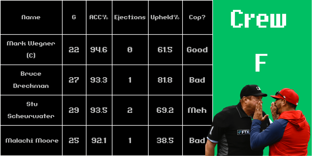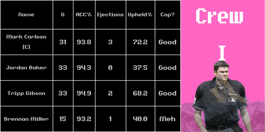 This will be one of the best crews out there as well. Chris Conroy is a ginormous fucking stoic stone statue. He’s 6’4” and built, and at 48 he gets crew chief honors. Good for him, he’s even-tempered and calming, with the most bombastic of his ejections coming when he correctly called runner’s lane interference on Trea Turner in 2021. Well, he did have this ejection of David Ross who correctly pointed out that Conroy’s crew didn’t convene on a HBP. Despite all this he has normal numbers posting a 93.6% ACC, but his xACC was 92.9, meaning he called more tough pitches around the edges than his colleagues.