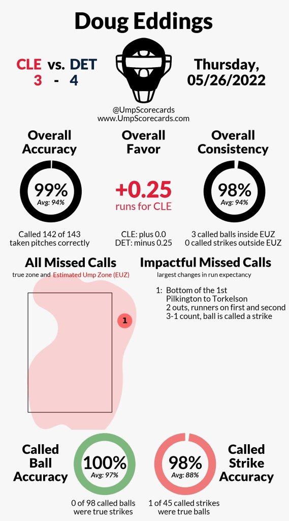 He has the reformed Brian Knight who, like a lot of umps, has a history of concussion problems. Brian hung around for 29 games though, and turned in an exceptional performance after being one of the worst ball-strike callers in recent years. His 94.7% ACC was almost a full point better than his xACC. He was very good behind the plate and on the field.