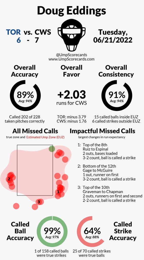 Lance Barksdale has earned every bit of the crew chief role. He has been one of the best umpires in the league for a long while now. He’s one of the most accurate and consistent umps behind the dish. He’s great in the field and with his temper. The only blemish you could fault him for were these missed calls in the 2019 World Series, where he still posted a 94.4%. Lance is great, you have nothing to worry about when he’s out there, he’s like the real Jay Landsman.