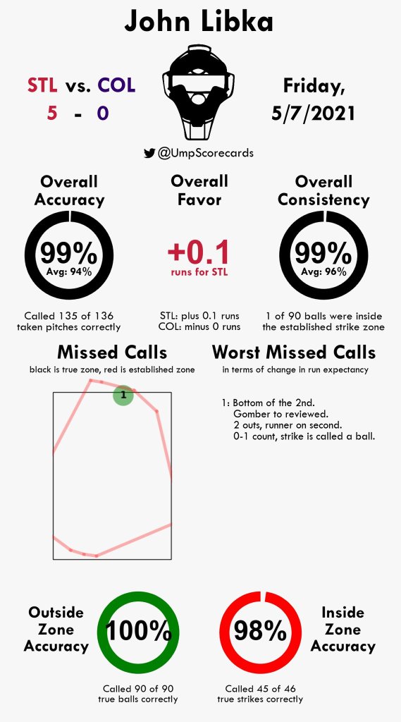 Tumpane calls balks, which I like, and he’s only wrong when David Ross challenges him because David Ross is the smartest manager in the game–I do not mean that sarcastically. Tumpane had a 73.7 Upheld%, and he has been one of the premier umpires in the league. I love John Tumpane, I will stan him until the end of time. He saved a woman from killing herself when he was in Pittsburgh, literally doing what a good cop should–most cops would have pushed her off the bridge and blamed a black guy for it. He called a near perfecto in Baltimore last year and five days later came to St. Louis and dropped 98%. Absolute gigaChad.