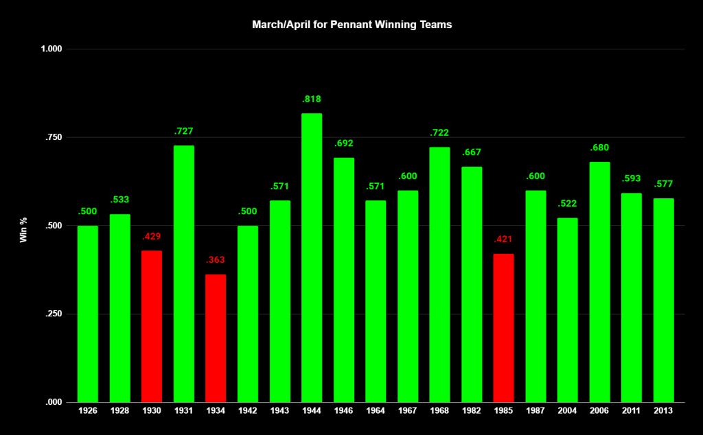 This isn’t to say the games in April do not matter. There’s a pattern here: of the 23 teams to reach the World Series, the Cardinals had losing April records with 3 of them (1985, 1934, 1930), they finished even twice (1926 and 1942), and above .500 every other time. Only once, 1968, did one of these teams finish below .500 for August and September combined.
