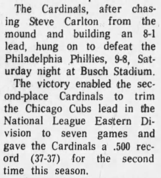 But this was the perfect time for things to implode. After that doubleheader sweep the Cards would drop 8 in a row and finish August 12-18, they slipped even further and lost first place on September 12th. Going into the last 5 games of the season they were 76-81 and 4 games back, and despite winning out to finish at .500 they missed the playoffs by one measly game to the Yogi Berra led Miracle Mets.