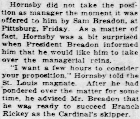 There’s also Hall of Famer Branch Rickey whose 1925 squad started off 5-8 before descending to the depths by the end of May with a 13-25 record. Rickey was fired and player-manager Rogers Hornsby promoted, who willed the team to a 64-51 mark the rest of the way and a World Series trophy the following year.