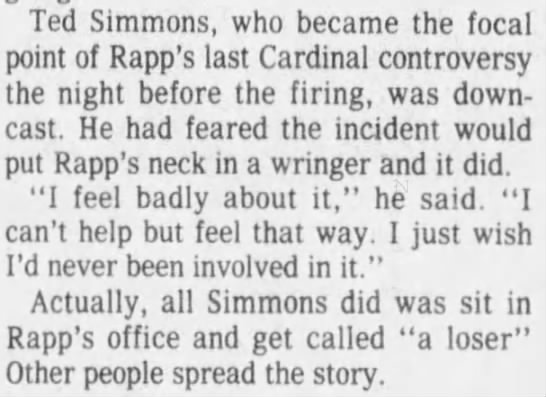 Some of these runs lost people their jobs. Take the 1978 squad that was headed by Vern Rapp. Rapp enjoyed a successful ’77 season but made a terrible habit of fostering a hostile clubhouse. He enforced dress codes and had Al Hrabosky shave off his mustache. One time he tore up the clubhouse after he caught his team playing music following a lost. His most infamous public feud came when he called Hall of Famer Ted Simmons “a loser.”